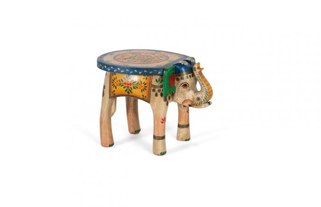 BANQUETA MADERA DE MANGO FORMA DE ELFANTE PINTADO A MANO MULTICOLOR MED: 48 X 35 X 35 XM ALTO