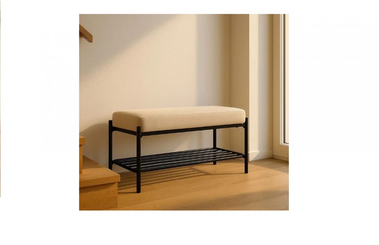 BANCO TAPIZADO COLOR BEIGE Y PATAS Y REPISA HIERRO NEGRO MED: 91 X 36 X 45 CM ALTO (TAMBIÉN EN MED: 51 X 37 X 45 CM ALTO)
