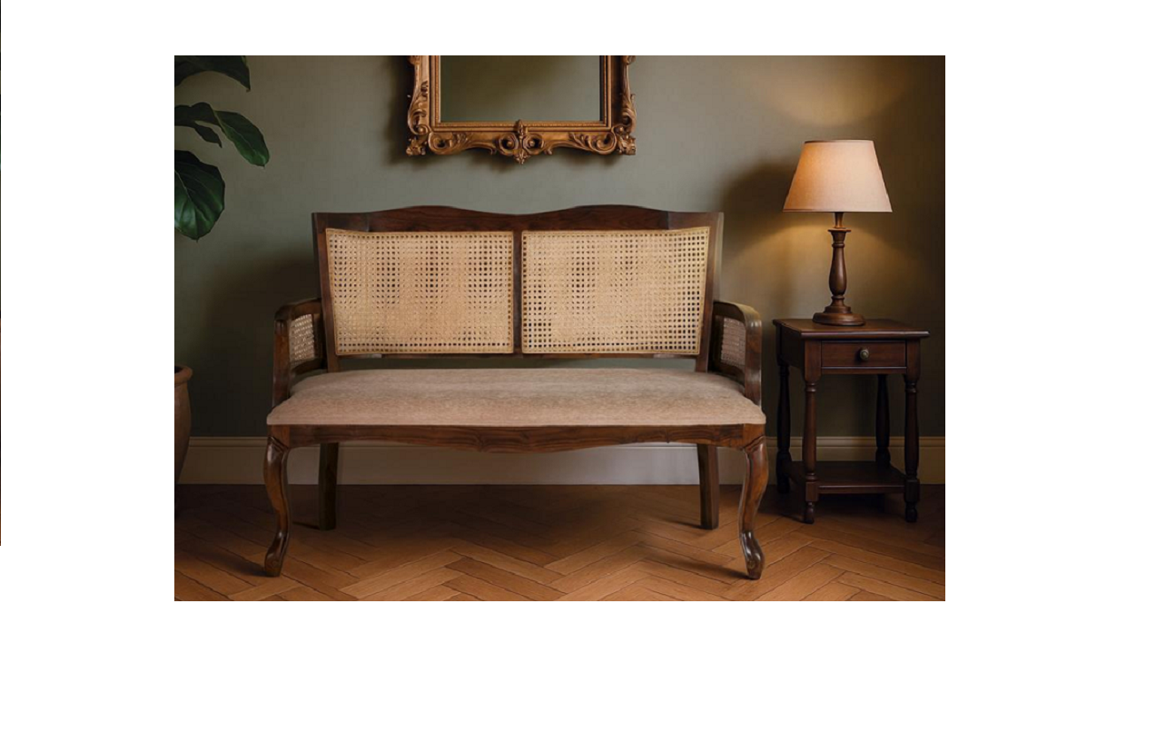 • BANCA DE MADERA DE ACACIA COLOR NOGAL TAPIZADO BEIGE Y RESPALDO Y BRAZOS CON REJILLA TEJIDA MED: 120 X 60 X 88 CM ALTO (SILLÓN A JUEGO)