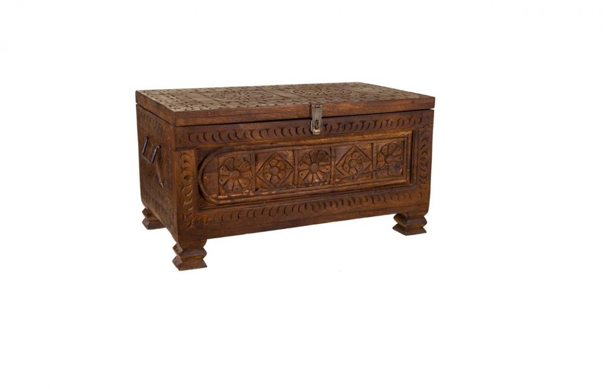 BAÚL MADERA TALLADA Y TIRADORES HIERRO MED: 65 X 37 X 33 CM ALTO