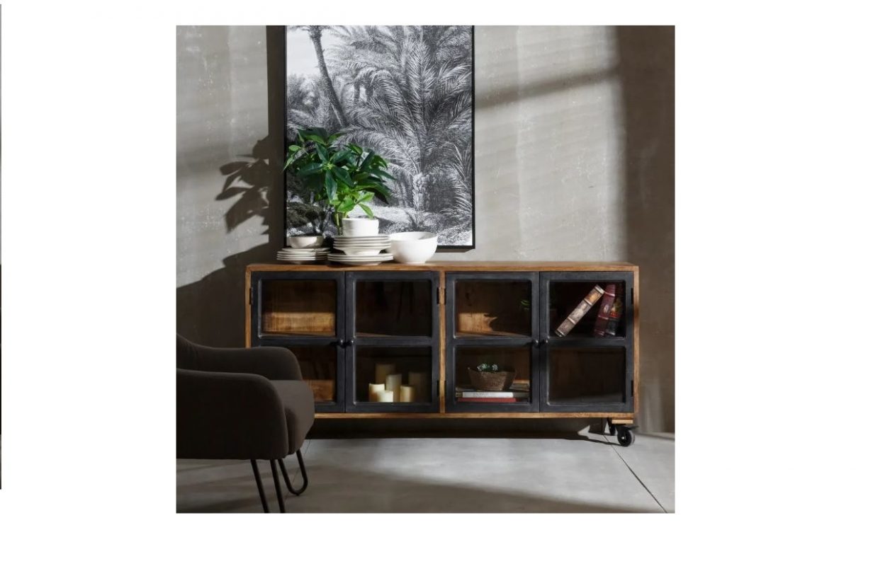 APARADOR 4 PUERTAS MADERA DE MANGO COLOR NEGRO / NATURAL / CRISTAL Y RUEDAS DE HIERRO MED: 160 X 35 X 71 CM ALTO