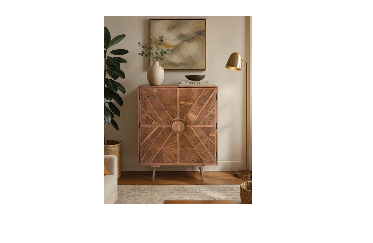 APARADOR PEQUEÑO 2 PUERTAS CON ESTANTES INTERIORES MADERA DE ACACIA CON TIRADORES TALLADOS A MANO MED: 110 X 40 X 74 CM ALTO