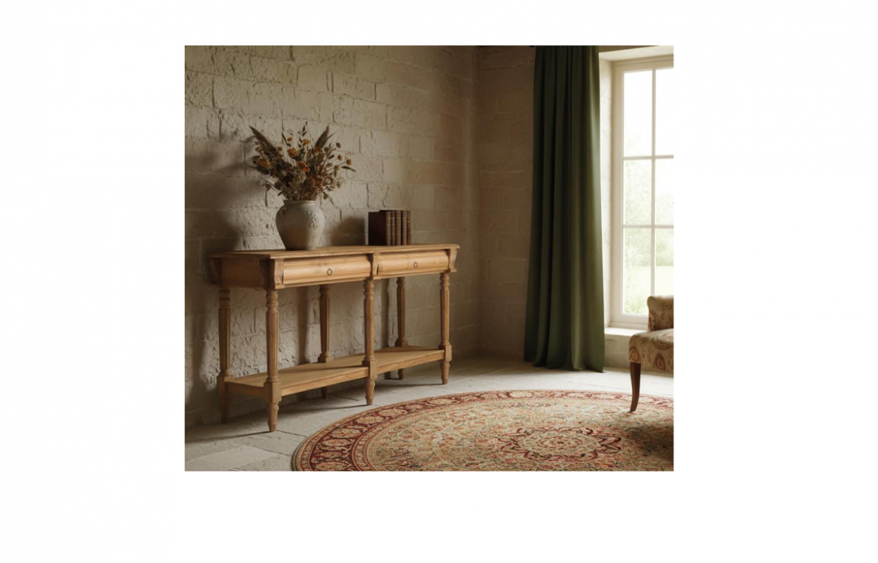 CONSOLA 6 CAJONES + BALDA INFERIOR MADERA DE MINDI ACABADO NATURAL MED: 130 X 35 X 85 CM ALTO
