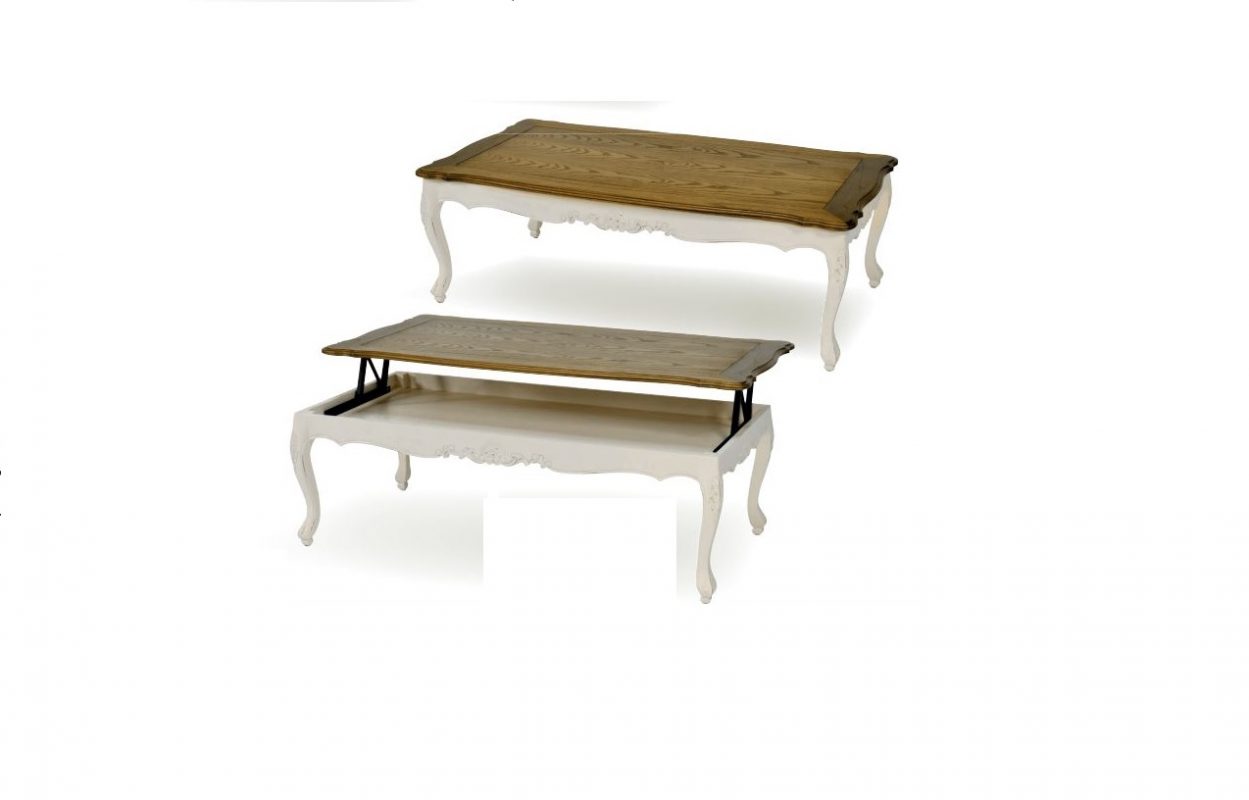 MESA DE CENTRO ELEVABLE LACADA COLOR BLANCO Y TAPA COLOR NOGAL MED: 130 X 70 X 42 CM ALTO