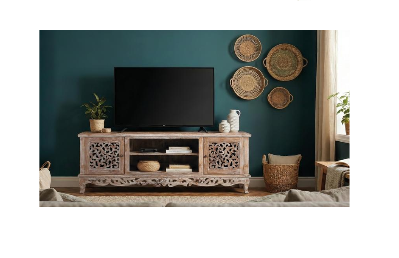 MUEBLE T.V. 4 PUERTAS MADERA DE MANGO ACABADO BLANCO ROZADO Med: 160 x 36 x 53 cm alto