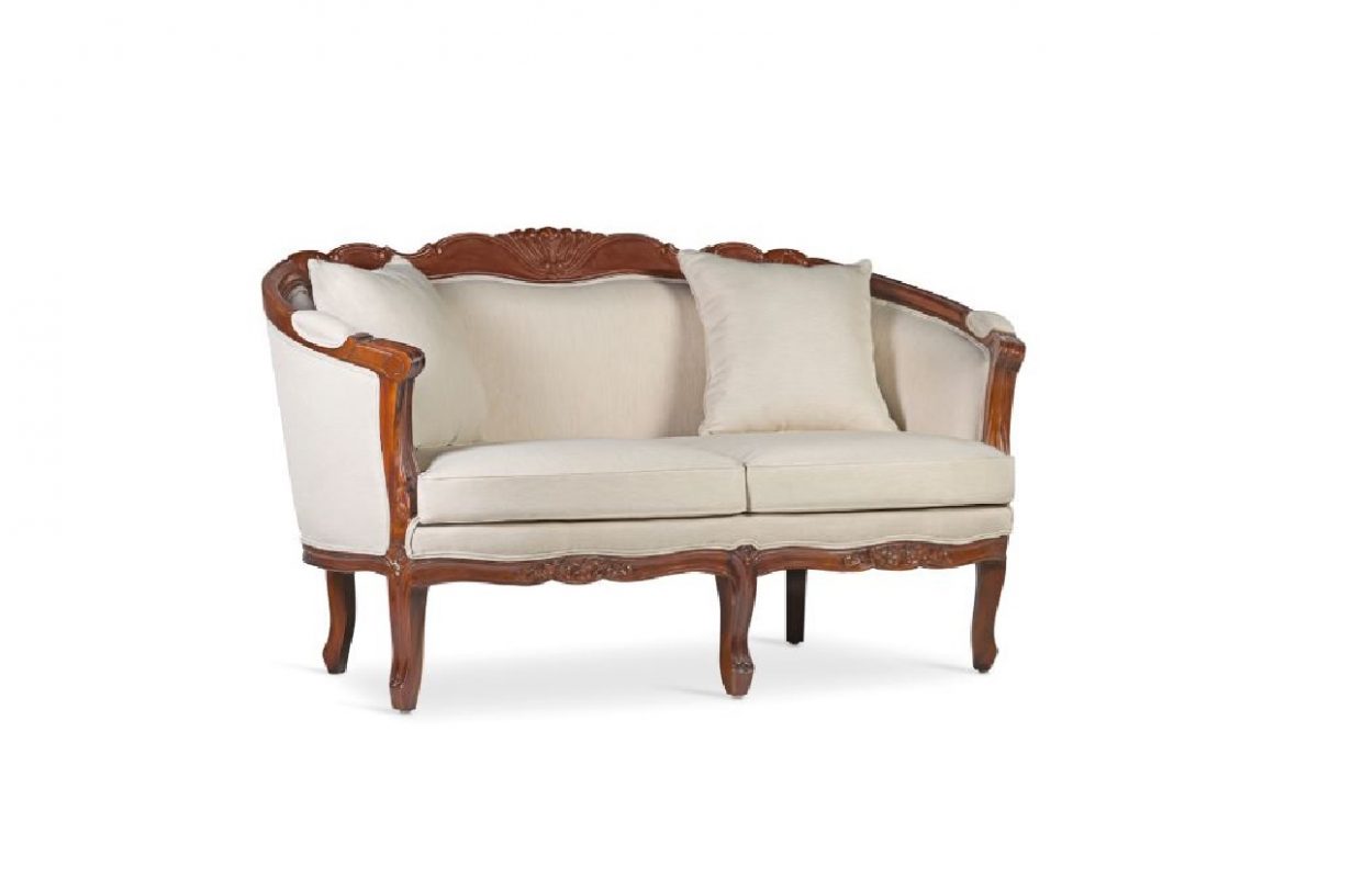 SOFÁ TAPIZADO MADERA DE CAOBA 2 PLAZAS CON COJINES MED: 160 X 75 X 90 CM ALTO