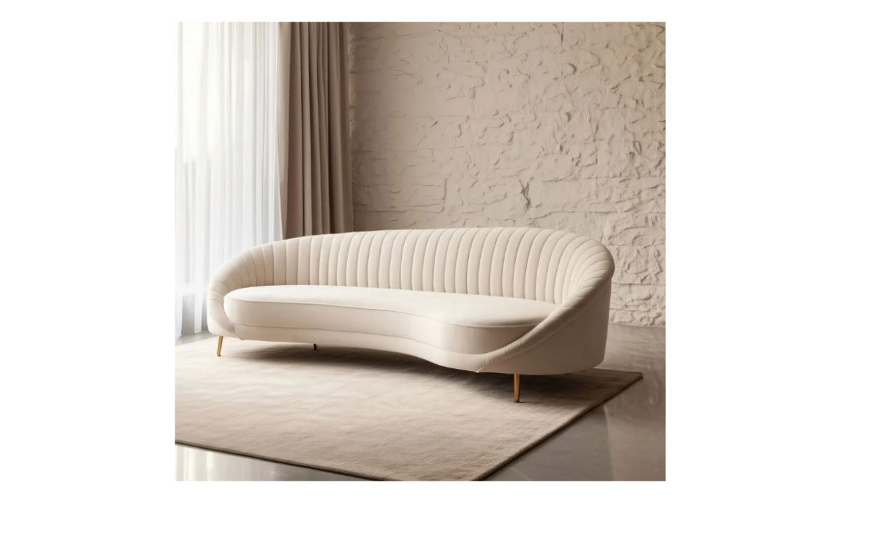 SOFÁ 3 PLAZAS CURVO TAPIZADO COLOR CREMA Y PATAS METÁLICAS DORADO MED: 247 X 105 X 81 CM ALTO