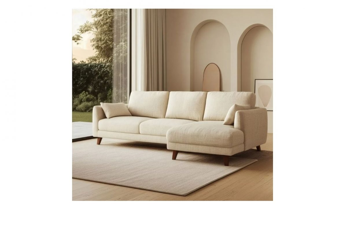 CHAISSE LONGUE GRAND TAPIZADO TELAS ANTIMANCHAS Y PATAS DE MADERA ESTILO NÓRDICO CON 2 COJINES DECORACIÓN Med: 272 x 173 x 92 cm alto (Varias telas a elegir)