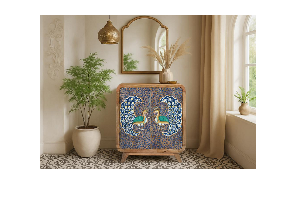 TAQUILLÓN MADERA DE MANGO 2 PUERTAS PINTADO A MANO CON MOTIVOS DE PAVOS REALES Y ESQUINAS REDONDEADAS MED: 65 X 33 X 77 CM ALTO
