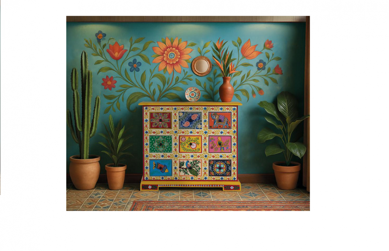 TAQUILLÓN 4 CAJONES Y 2 HUECOS MADERA DE MANGO CON DETALLES PINTADOS A MANO MED: 88 X 35 X 79 CM ALTO